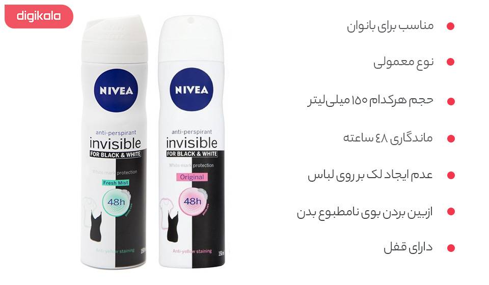 پک اسپری دو عددی برند «نیوآ» (Nivea) شامل اسپری مدل «Fresh Mist» و «Original» است که هر دو برای استفاده بر روی لباسهای سفید و سیاه و تیره و روشن مناسب هستند و آسیبی به رنگ لباسها نزده و هیچگونه رد و لکی برجا نمیگذارند. حجم هرکدام از اسپریها معادل 150 میلیلیتر است و محفظهی آنها دارای قفل است که در صورت استفاده نکردن میتوانید آنها را قفل کنید. نوع هر دو اسپری معمولی است. اسپریهای Original و Fresh Mist بوی نامطبوع بدن را ازبین میبرند و مانع از ایجاد بوی نامطبوع میشوند. اسپریهای ضدتعریق نیوآ تا حدوداً 48 ساعت ماندگاری دارند و پوست و لباسهای شما را خوشبو نگه میدارند. پک دو عددی اسپریهای ضدتعریق مدل Fresh Mist و Original برند نیوآ برای استفادهی بانوان مناسب هستند و از نظر اقتصادی هم مناسبتر هستند.