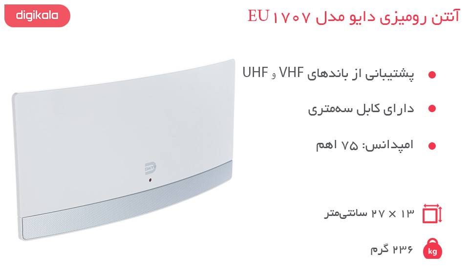 برای خرید و مشاهده جزئیات محصول کلیک نمایید. آنتنهای رومیزی باعث میشوند سختیهای تنظیمکردن آنتنهای هوایی را نداشته باشید. این دسته از محصولات با قدرت گیرندگی بالایی ساخته میشوند و میتوانند بهراحتی تمامی شبکههای صداوسیما را دریافت کنند. ابعاد و وزن آنها نیز جمعوجور است و برای قرارگرفتن روی میز کنار تلویزیون گزینههای بسیار خوبی محسوب میشوند. در ادامه در مورد EU1707 یکی از آنتنهای رومیزی دایو توضیح بیشتری ارائه میکنیم. نوع سیگنال دریافتی توسط این آنتن دیجیتال است و نسبت به سیگنال آنالوگ، کیفیت بسیار بهتری به کاربران ارائه میکند. EU1707 به گیرندهی باند داخلی UHF و VHF مجهز است. گفتنی است باند UHF در این آنتن با محدودهی فرکانسی 470 تا 790 مگاهرتز پشتیبانی شده است و قابلیت دریافت کانالهای 21 تا 69 را دارد. همچنین پهنای فرکانس در این باند برای هر کانال 8 مگاهرتز است. باند VHF نیز در محدودهی فرکانسی 174 تا 230 مگاهرتز پشتیبانی شده و امکان دریافت کانالهای 1 تا 12 را فراهم میکند. پهنای فرکانسی هر کانال 7 مگاهرتز بوده و امکان دریافت تصویری واضح و مطلوب را ممکن ساخته است. امپدانس این آنتن 75 اهم بوده و کاملا برای آنتن تلویزیونی استاندارد است. این آنتن با بدنهی پلاستیکی و رنگ سفید ساخته شده است. طراحی آن به شکل منحنی بوده و روی یک پایه بهراحتی روی میز قرار میگیرد. ابعاد آن 13 × 27 سانتیمتر بوده و وزنش به 236 گرم میرسد. ظاهر ساده و نسبتا مدرن این محصول باعث میشود بتوانید آن را بهعنوان یک کالای دیجیتالی بهراحتی روی میز قرار دهید. طول کابل آنتن نزدیک به سه متر است و نیازی نیست آن را نزدیک به تلویزیون قرار دهید. یک عدد پیچ کنترلگر در قسمت پشتی آنتن تعبیه شده است که میتوانید از آن برای تنظیم گیرندگی آنتن و دریافت تصویر استفاده کنید.
